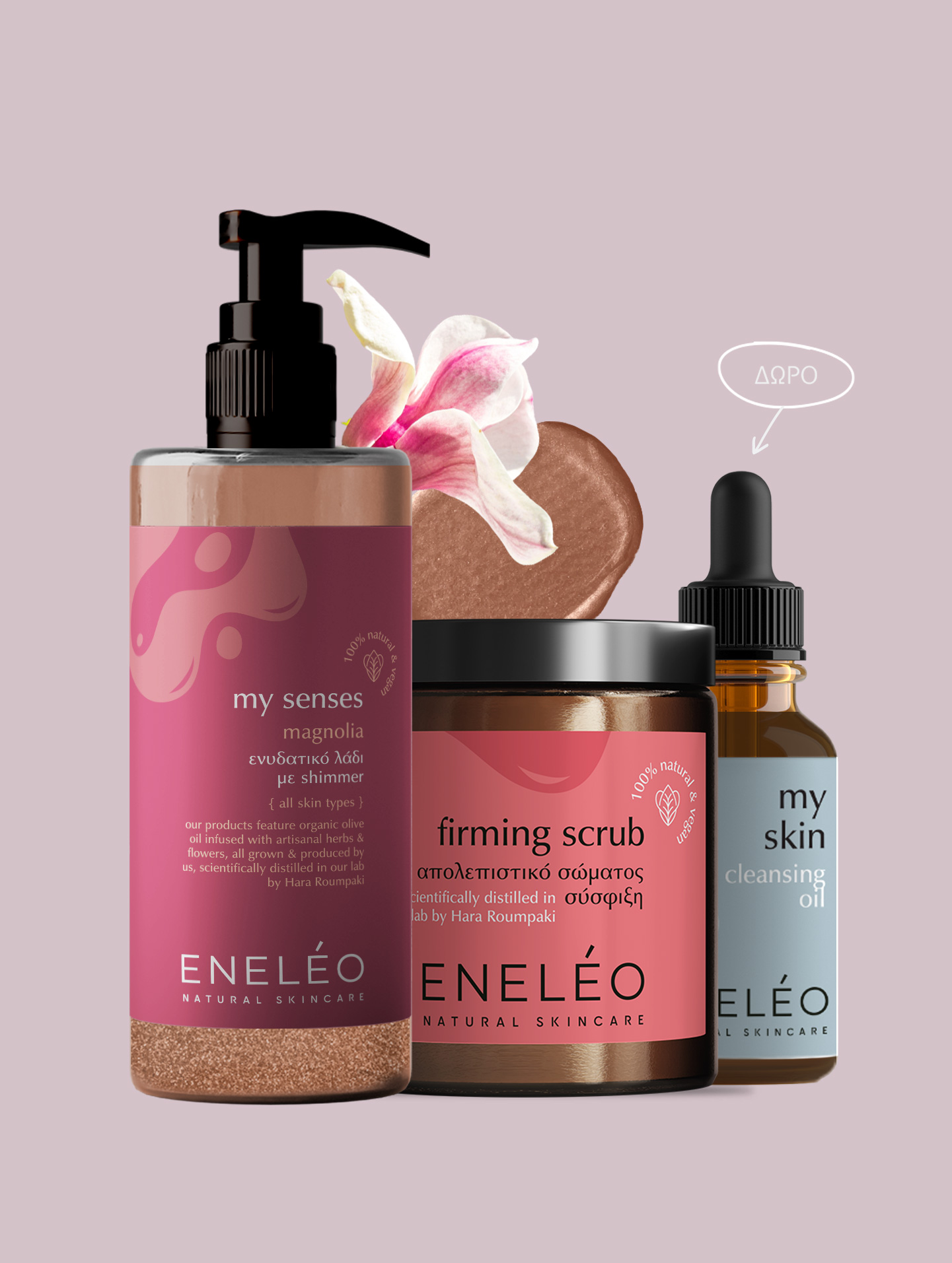 My Senses Magnolia – Calendula Officinalis Flower Extract*, Carthamus Tinctorius Seed Oil, Prunus Amygdalus Dulcis Oil, Cocos Nucifera Oil, Hibiscus Sabdariffa Flower Extract*, Butyrospermum Parkii Butter, Fragrance, Tocopheryl Acetate, Mica. *Extracted in the olea europaea fruit oil ΒΙΟ